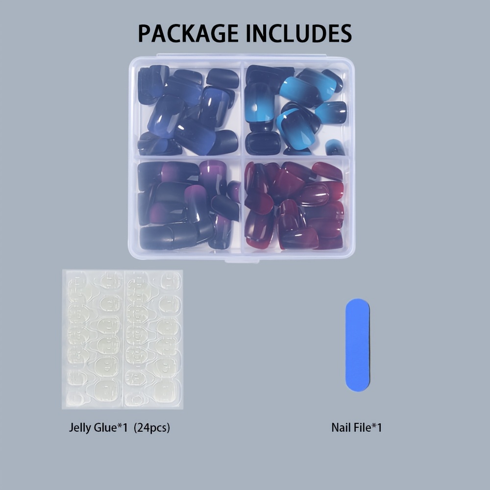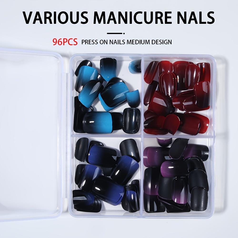 96pcs LuxePress Mixed Colors Short Square Full Cover Press-On Nails Set, Gradient Solid Color Artificial Nail Kit with Jelly Glue, Nail File & Wooden Stick for Women and Girls, Glossy Finish Removable Fake Nails for Daily Wear, Parties & Home Use