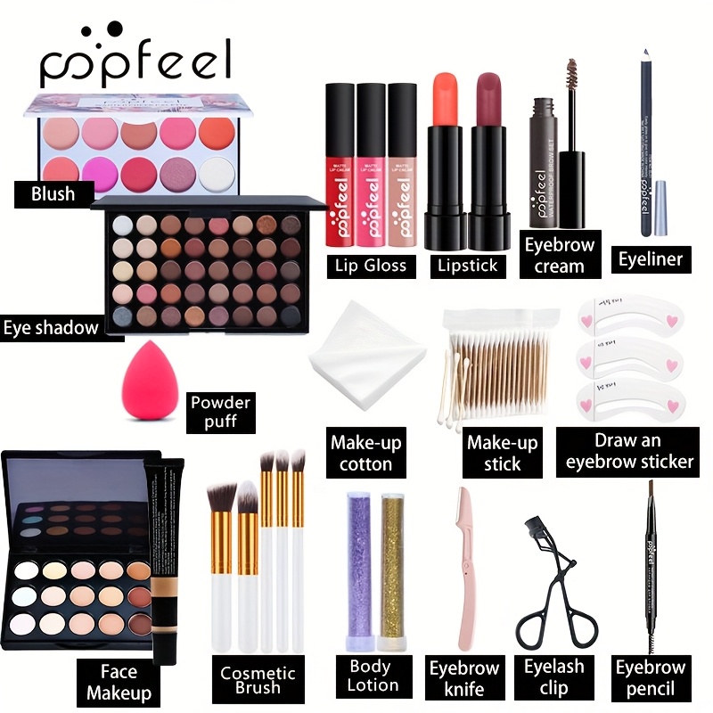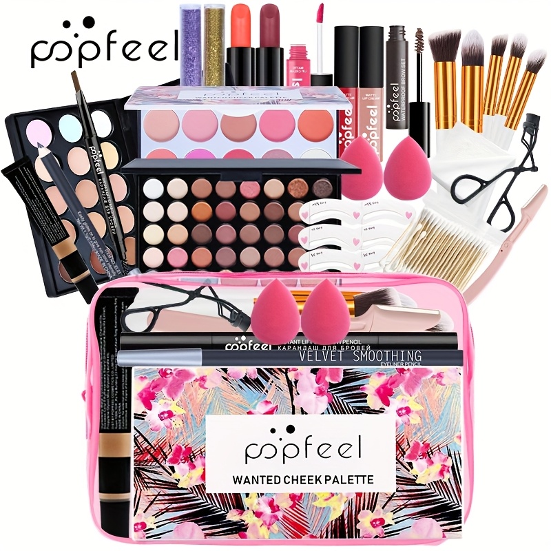 POPFEEL Beginner Makeup Kit, Complete Cosmetic Set with Brushes and Bag, Mixed Color System, Paste Form, Professional Beauty Tools for Makeup Application